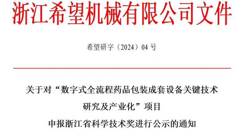 关于对“数字式全流程药品包装成套设备关键技术研究及产业化”项目 申报浙江省科学技术奖进行公示的通知
