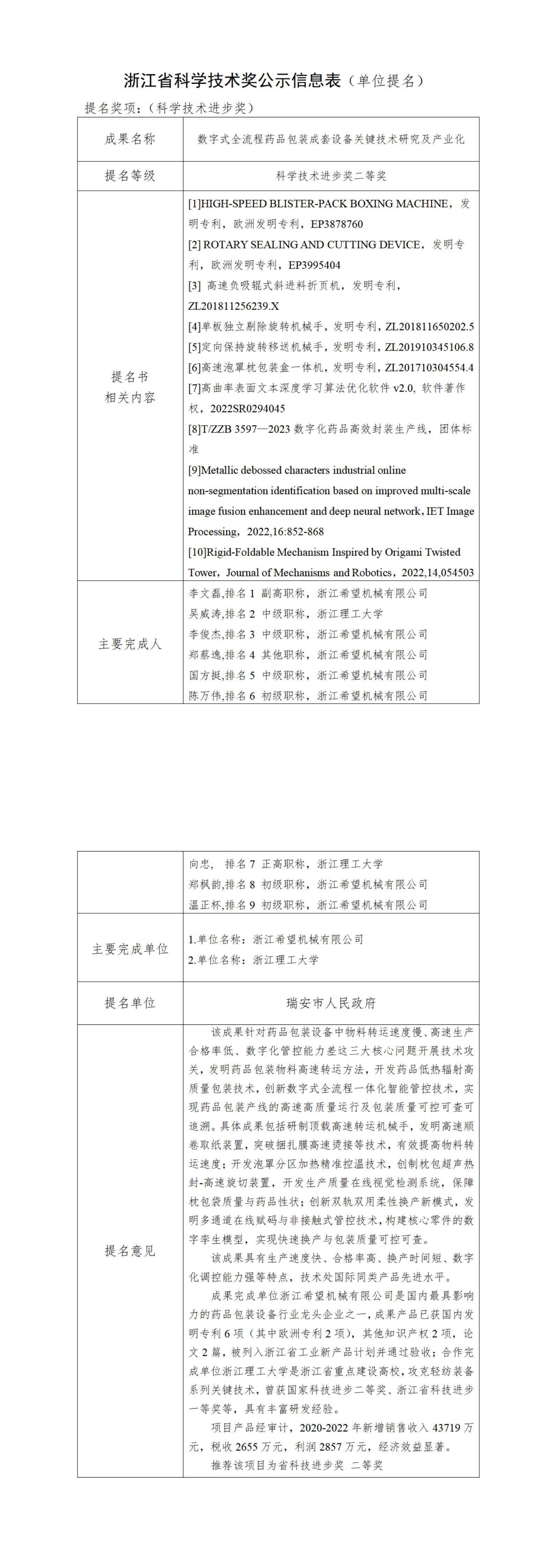我公司“数字式全流程药品包装成套设备关键技术研究及产业化”项目研制开发成功后,获得了较好的经济效益和社会效益,符合申报2023年度浙江省科学技术奖申报条件,根据浙江省科学技术厅《关于开展2023年度浙江省科学技术奖提名工作的通知》及《浙江省科学技术奖励办法》等规定要求,对本项目相关内容进行公示,公示时间从2024年8月19日开始至2024年8月25日结束,如对公示内容有异议,可在公示期内向公司总经办反映。
